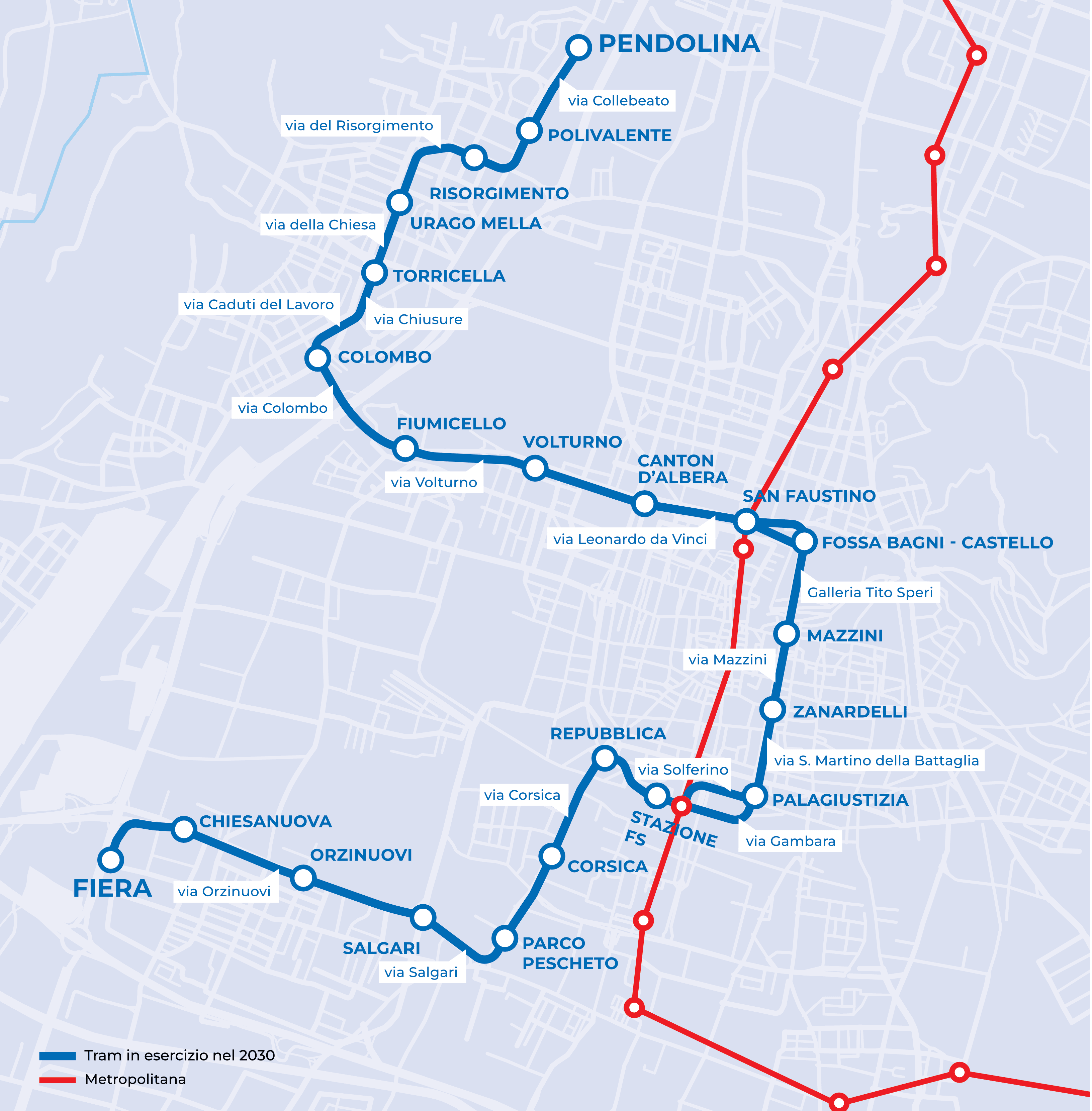 22 fermate lungo un percorso pensato per chi si sposterà ogni giorno e per chi arriverà da fuori città : toccherà quartieri residenziali, il centro storico, la stazione ferroviaria, ospedali, uffici pubblici, aree produttive e i poli fieristici.Â